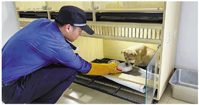 在杭州机场场区小动物爱心驿站内,工作人员正在喂食流浪小动物。王镇逾 摄