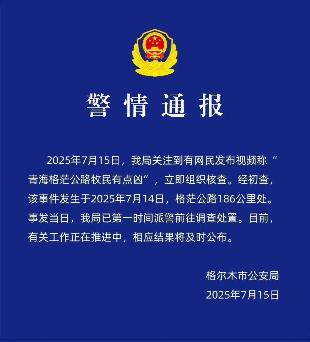 2025年7月15日,我局关注到有网民发布视频称“青海格茫公路牧民有点凶”,立即组织核查。经初查该事件发生于2025年7月14日,格茫公路186公里处,事发当日,我局已第一时间派警前往调查处置。